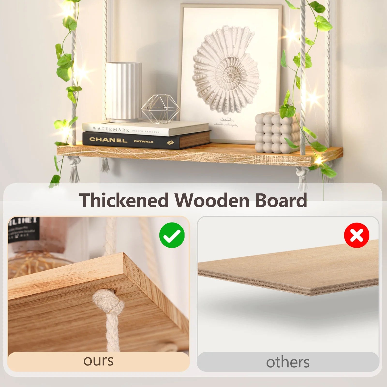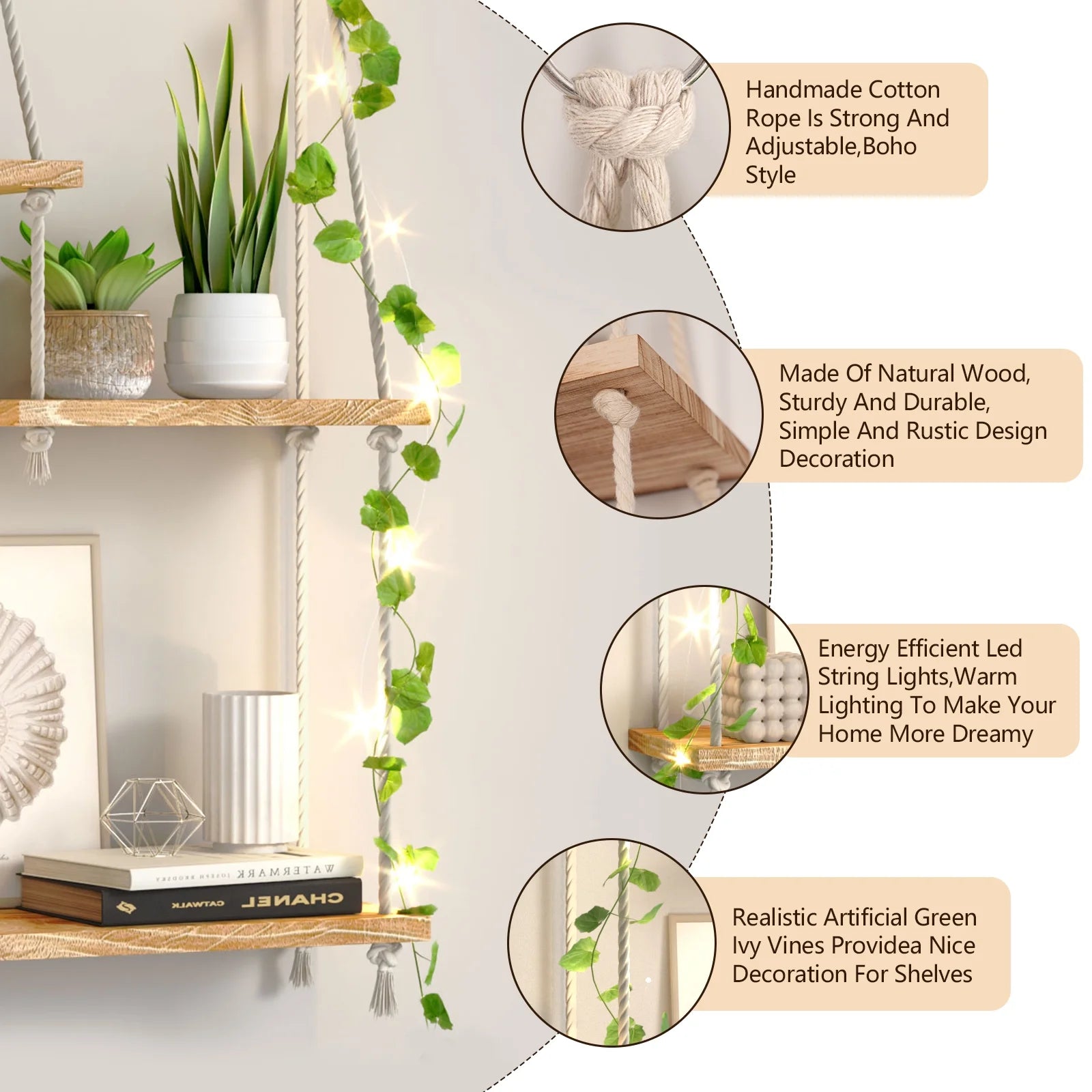 Hanging shelf features a rope - suspended, multi - tiered wooden design. With artificial vines and lights, it adds a boho - chic vibe. Great for displaying plants, decor, and small items, it’s easy to install, sturdy, and suits various home and commercial spaces to elevate style.